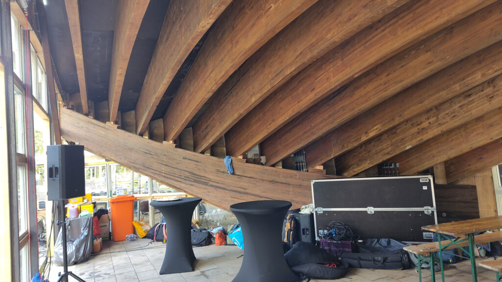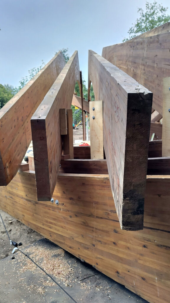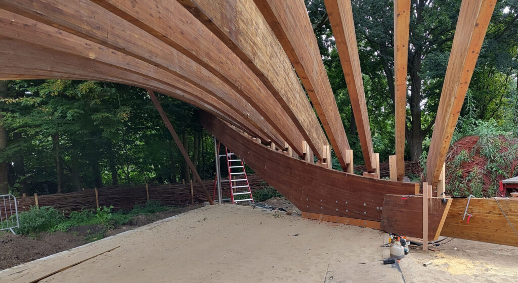 Niet alleen de spanten, maar ook het hout, staal en de verbindingsmiddelen zijn afkomstig uit hergebruikte bronnen. Dit vroeg om een flexibele werkwijze, waarbij het ontwerp regelmatig is aangepast aan de beschikbaarheid van materialen.