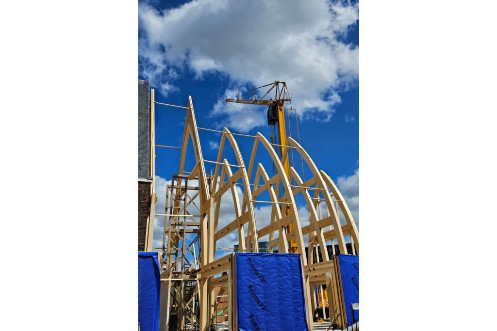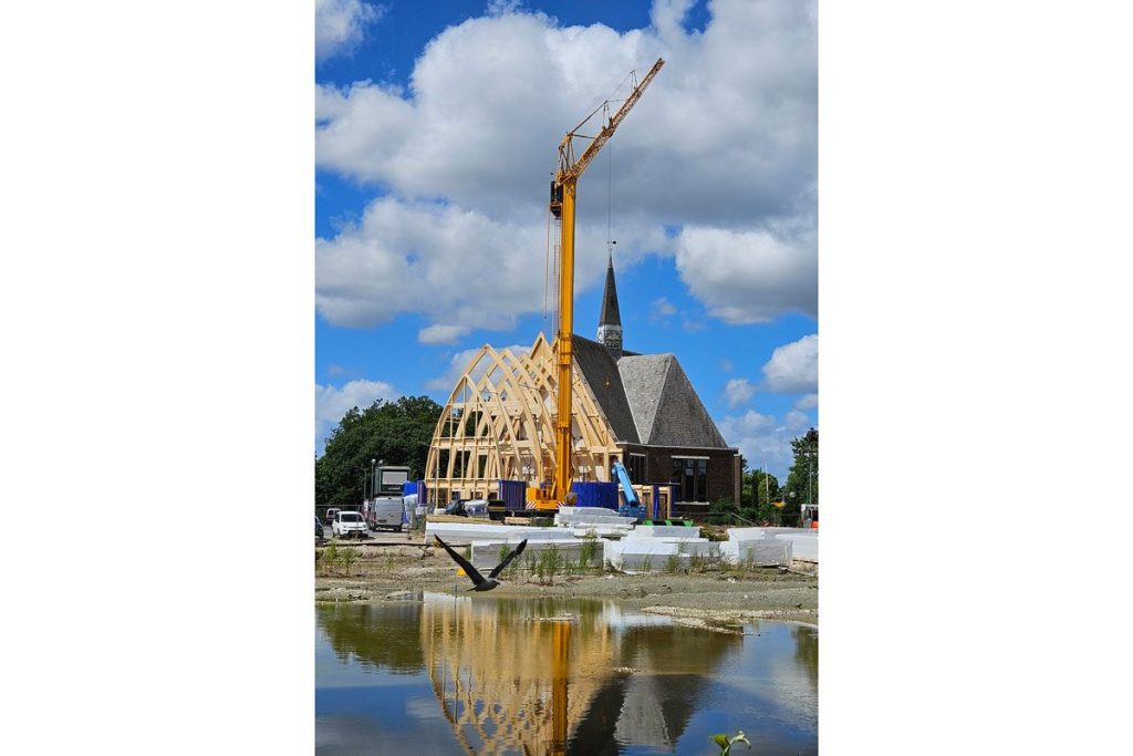 Na jaren van voorbereiding en een succesvolle start van de bouw in februari 2024, zijn de vorderingen goed zichtbaar. De houten spanten, die een verbinding vormen tussen het oude en het nieuwe deel van de kerk, geven het gebouw een uniek karakter.