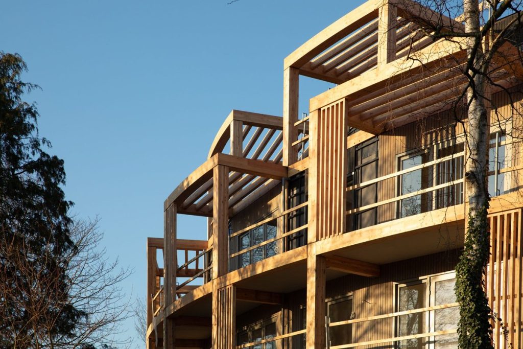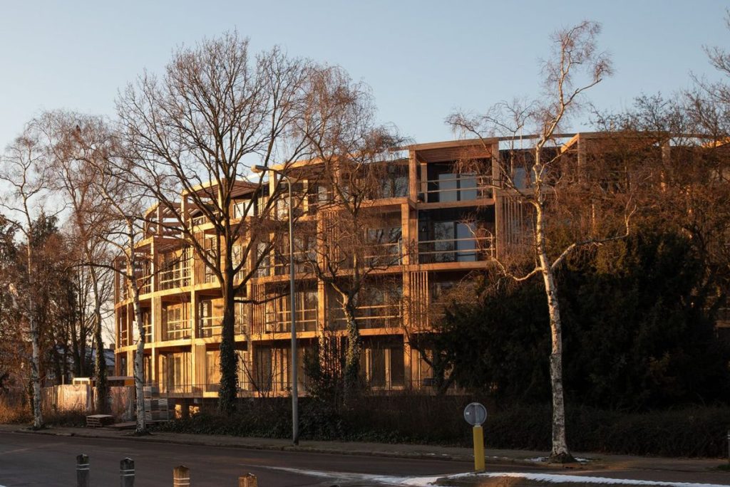 De gevels van alle appartementen en algemene ruimten zijn uitgevoerd als geïsoleerde houtskeletbouw elementen met een houten gevelbekleding. De galerijen en balkons zijn prefab platen die op de houtconstructie rusten.