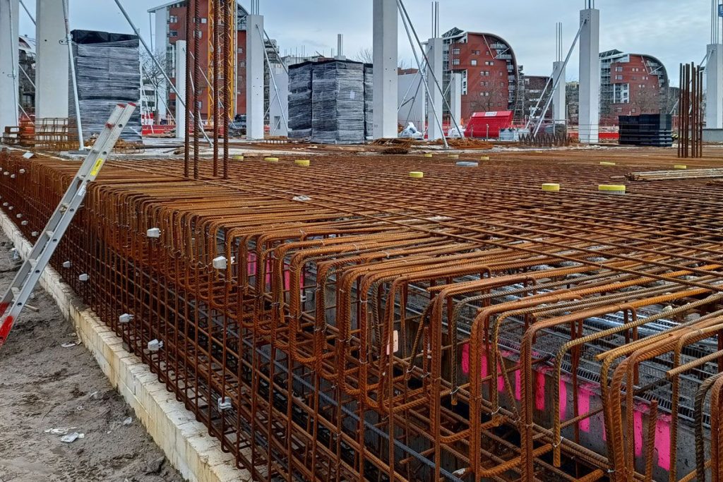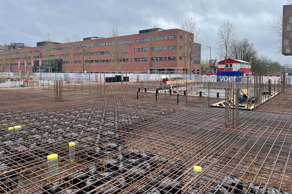 Het eerste vloerveld van de beganegrondvloer van het onderwijsgebouw is inmiddels gestort. Deze volledig in het werk gestorte Cobiax vloer heeft geen prefab-schil, maar wordt volledig in het werk gevlochten op een Topec systeem en vervolgens in 2 gangen gestort. Op dit vloerveld zijn reeds enkele prefab kolommen en schoonwerk prefab wanden geplaatst.