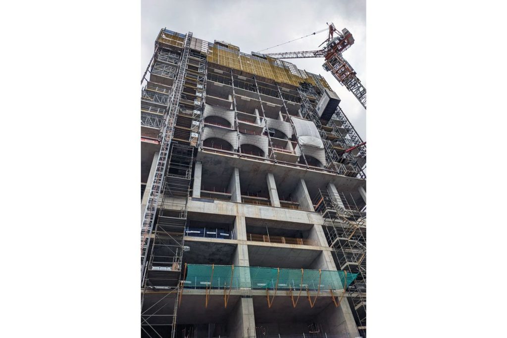 In de net gestorte vloer van de 15e verdieping zijn instortvoorzieningen voor de kraan meegenomen. Als de 15e verdieping voldoende is verhard, zal de kraan weer een stukje hoger klimmen.