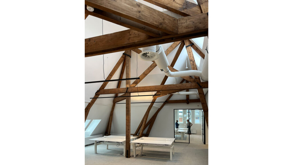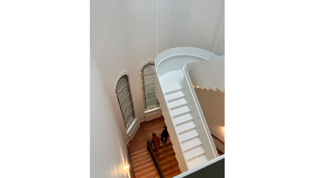 Tijdens een eerdere renovatie (1999) is de zolderverdieping opgetopt en geschikt gemaakt als kantoorverdieping. Het bestaande trappenhuis werd toen verhoogd met één bouwlaag en voorzien van een renovatietrap. In het nieuwe ontwerp van DP6 is de traptoevoeging verwijderd en vervangen door een stalen trap. De nieuwe, volledig samengestelde stalen trap rust op de verdiepingsvloer en is opgehangen aan het dak. De trap is daarmee een ware eyecatcher geworden, met respect voor het onderliggende klassieke houten trappenhuis.