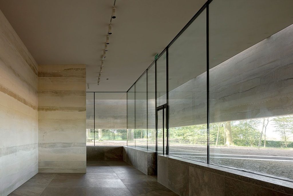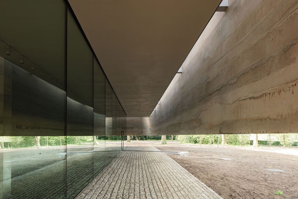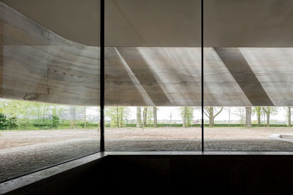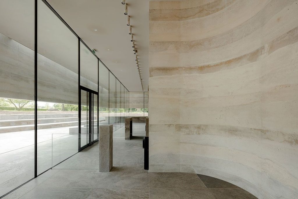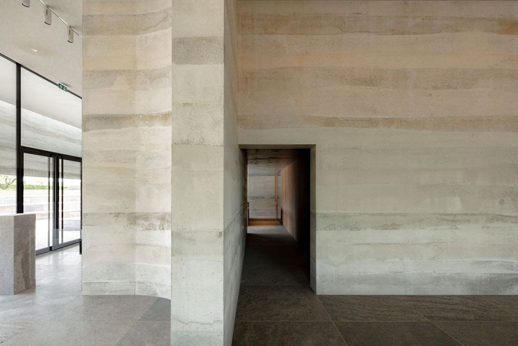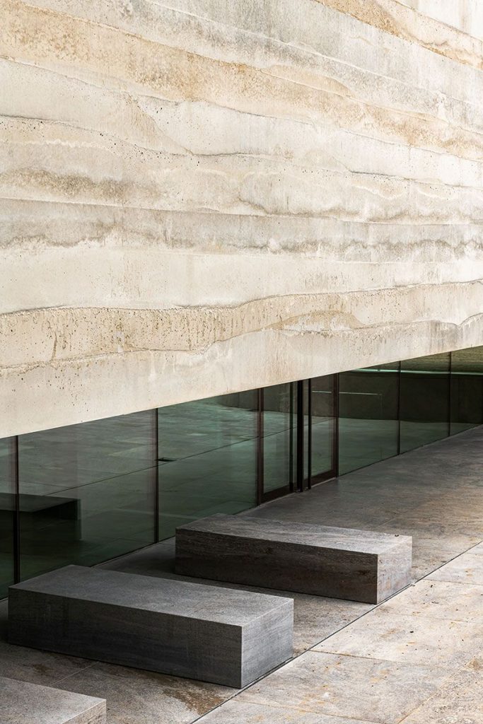De sculpturale betonwanden zijn aan de buitenzijde nergens afgewerkt, zodat het ‘laagjes beton’ ook hier overal zichtbaar is.