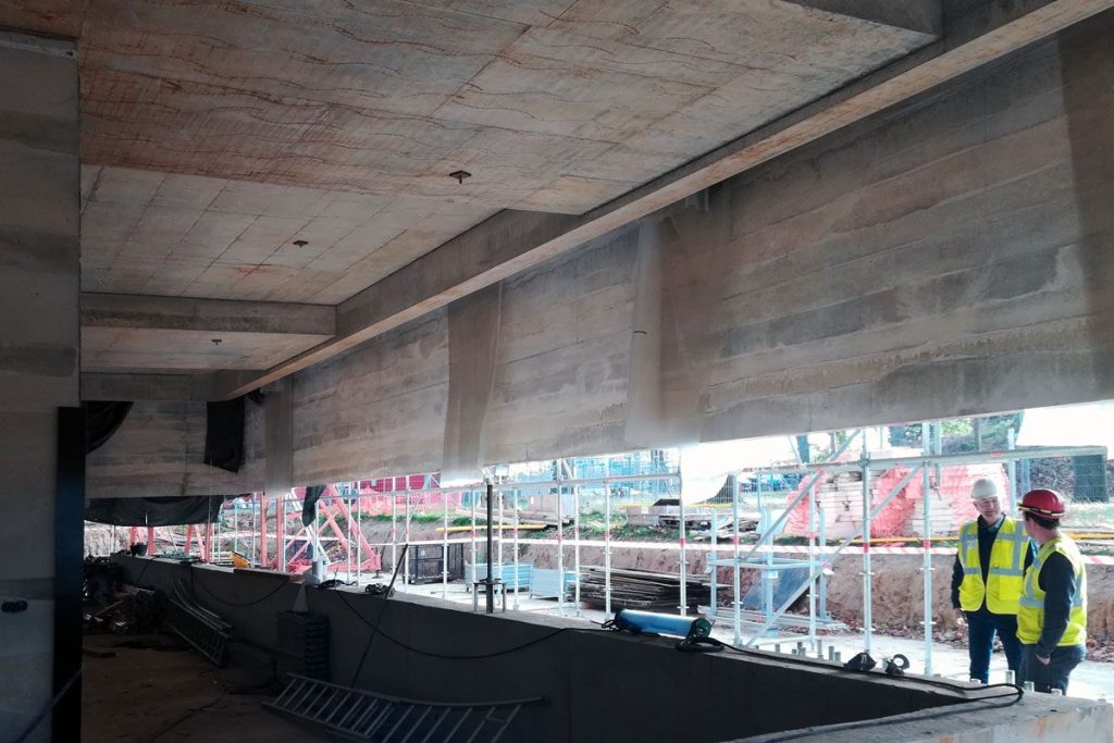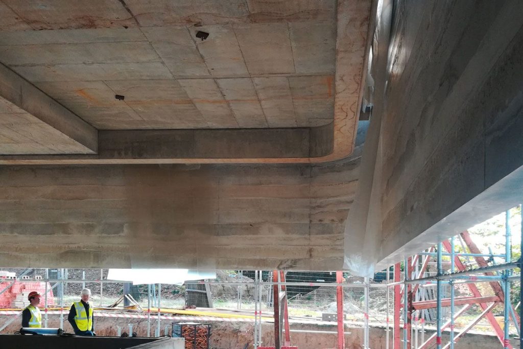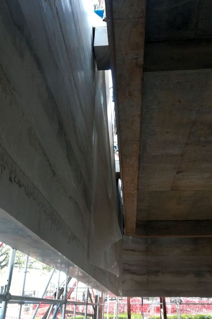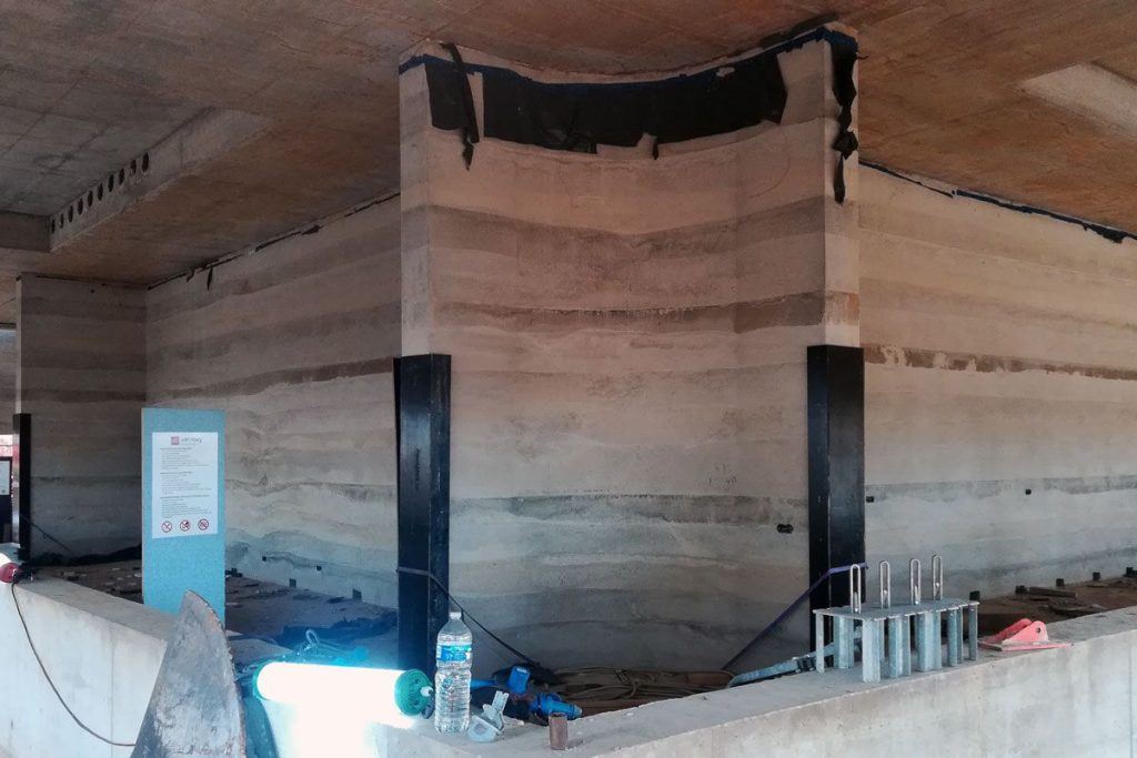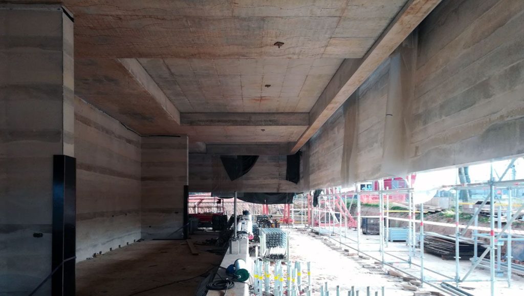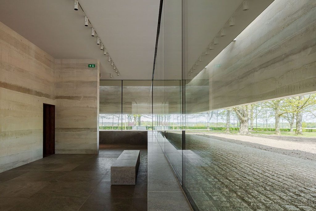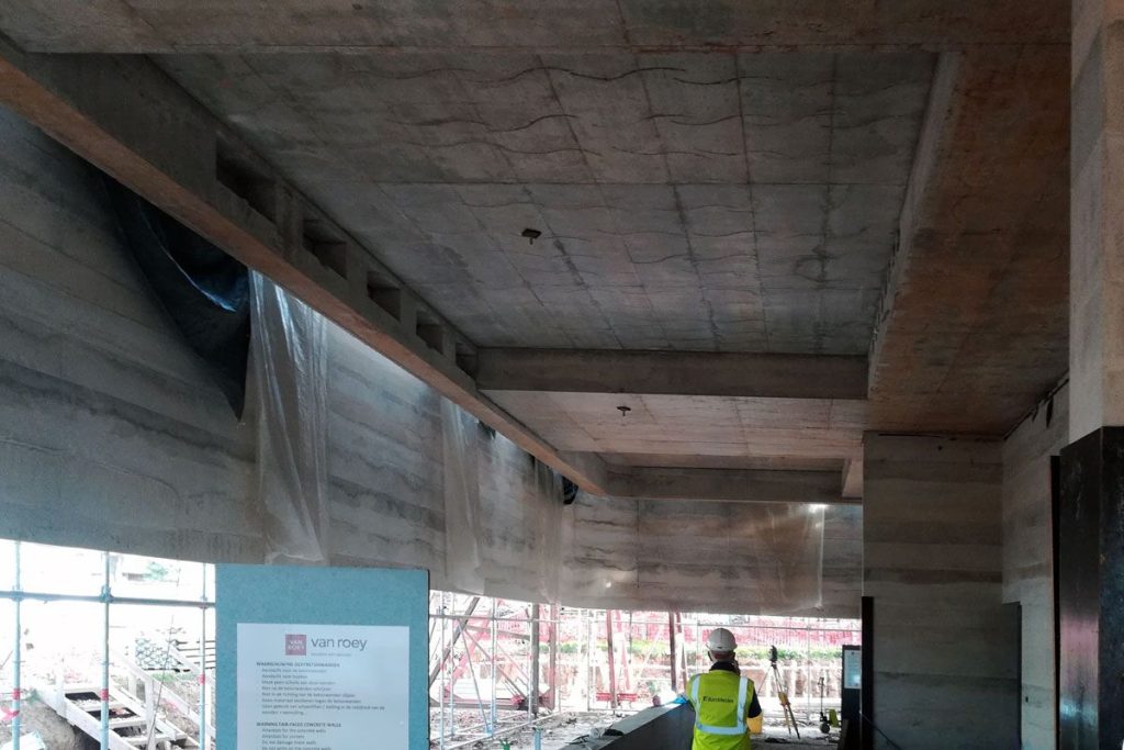 De sculpturale betonwanden zijn aan de buitenzijde nergens afgewerkt, zodat het ‘laagjes beton’ ook hier overal zichtbaar is.