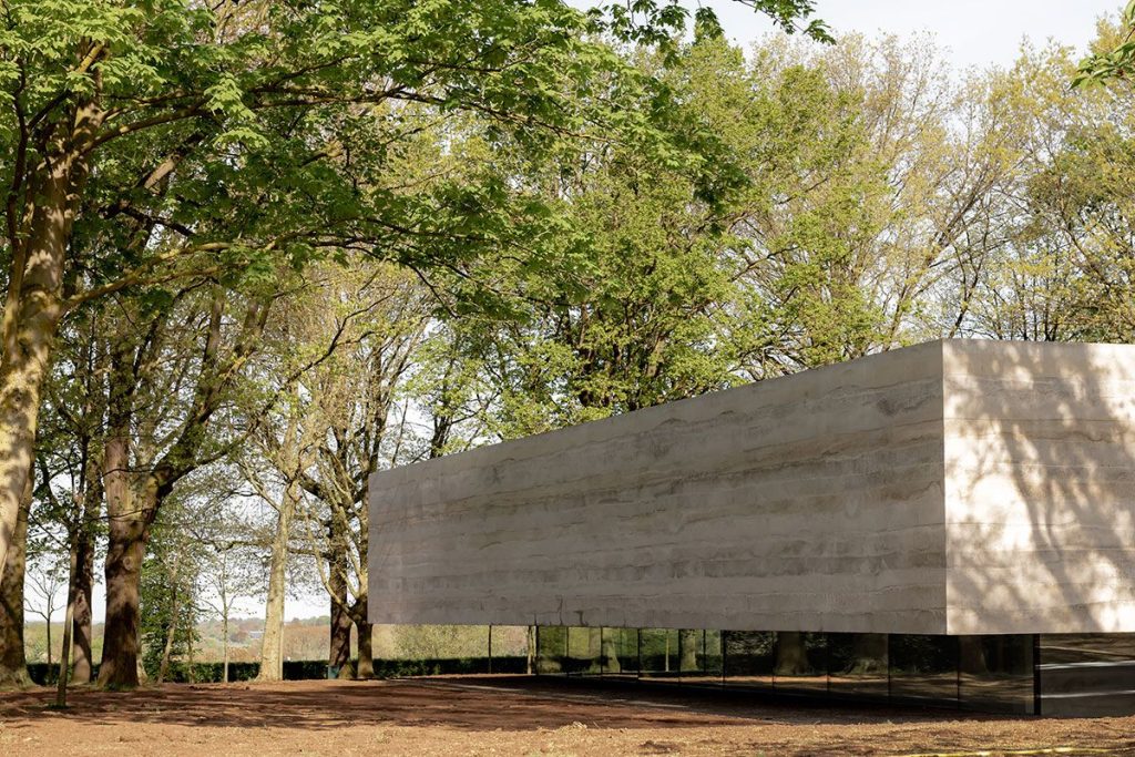 Het nieuwe bezoekerscentrum ligt enigszins verscholen tussen de bomen en iets verdiept in het maaiveld, op enige afstand van de entree van de begraafplaats met de bestaande monumenten. Vanaf een afstandje lijkt het alsof een groot, circa 30 meter breed, licht kleurig natuurstenen vierkant blok boven het maaiveld zweeft.  Het zwevende blok is echter geen blok, maar een 4 meter hoge en 30 centimeter dikke monoliete vrijhangende gelaagde betonnen gevel, welke is opgehangen aan 6 relatief slanke nokken per zijde. Tussen de vrijhangende gevel en de achterliggende balk zit een spleet van 25 centimeter waar het daglicht door naar binnen komt. Hierdoor lijkt de betonnen gevel ook vanaf binnen daadwerkelijk te zweven. Alleen degene die er echt op let ziet de nokken.