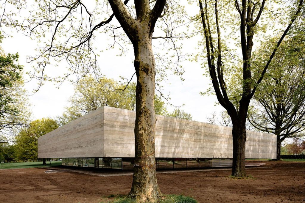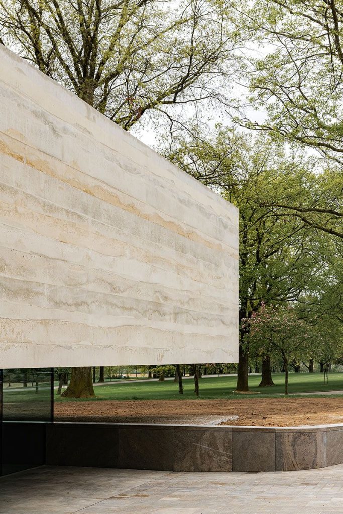 De monoliete betonnen gevel van 29×29 meter is uitgevoerd in gelaagd beton, met licht golvende lagen welke licht in kleur verschillen. Centerpengaten of duidelijke bekistingsnaden ontbreken echter, waardoor het beton nog meer de indruk geeft van het lichte natuursteen, waar ook de andere monumenten van zijn gemaakt.