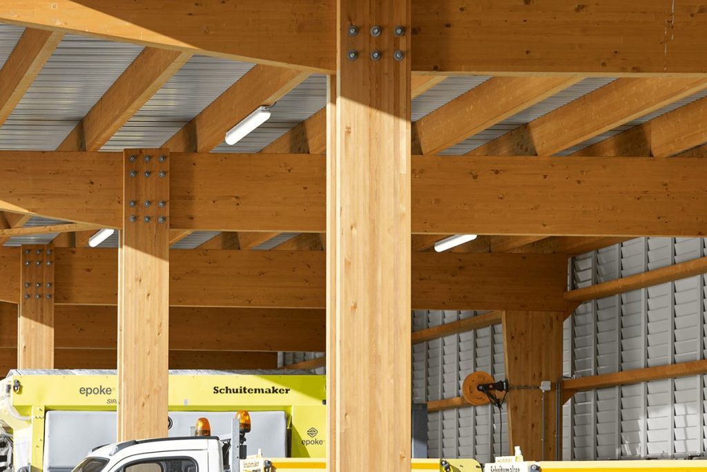 De begane grond kan grofweg opgedeeld worden in twee zones: de zone werkplaats en stalling met een minimaal benodigde netto binnenhoogte van 5 meter en de zone waar de kantine met ondersteunende functies is gesitueerd. Deze zone heeft een netto hoogte die is afgestemd op een vrije doorrijhoogte van 4 m onder de uitkraging.