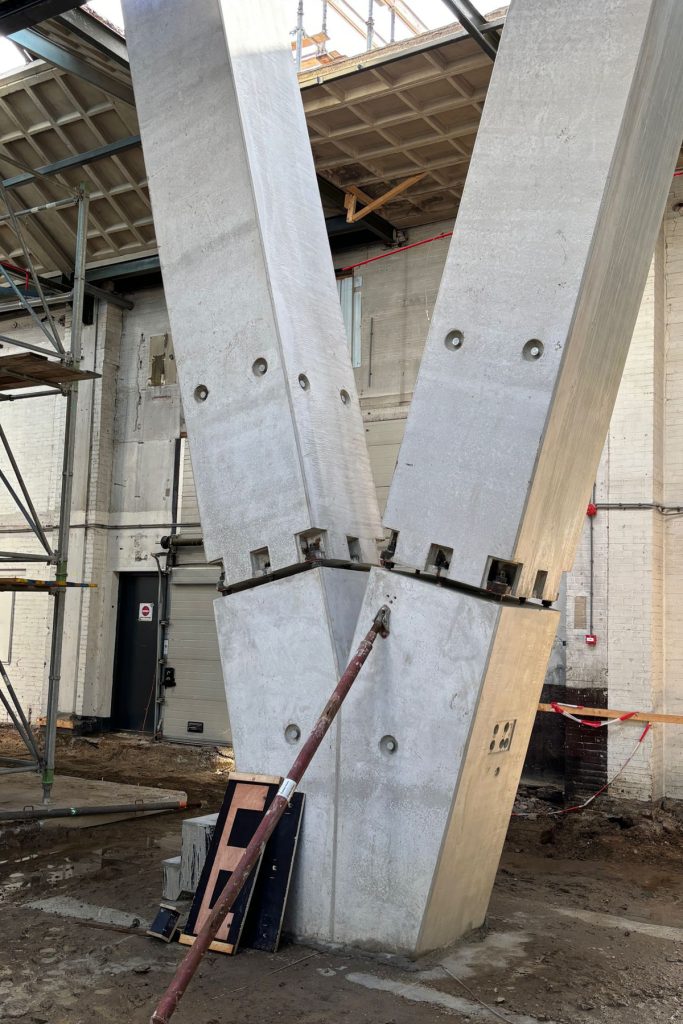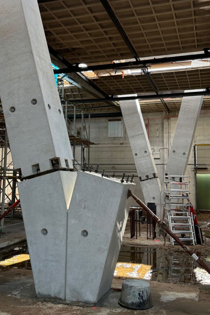 De kolommen waarop het gebouw staat worden als prefab segmenten aangevoerd. Vanwege de kraancapaciteit moesten deze 15m hoge kolommen opgedeeld worden in kleinere delen. Die worden middels een geschroefde verbinding aan elkaar gekoppeld, waardoor ze direct na montage vast staan.