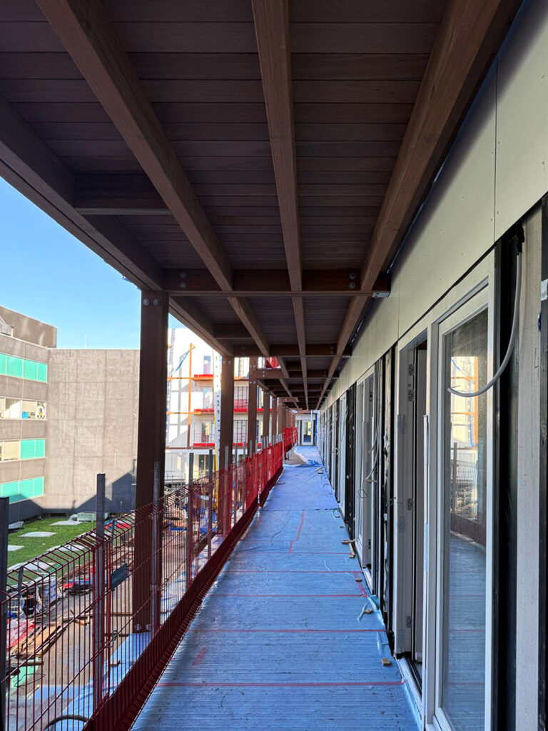 Het ontwerp van de hoofddraagconstructie is gebaseerd op een hybride systeem van geprefabriceerde houten elementen. Dragende CLT wanden worden afgewisseld met gelamineerde kolommen en balken. Als vloersysteem is CLT toegepast die als plafonds onafgewerkt in het zicht blijven. Door de structurele wanden af te wisselen met houten portalen voldoen we aan eisen voor stabiliteit, akoestiek en brandveiligheid. Daarbij garandeert deze aanpak ook toekomstige flexibiliteit, omdat niet-dragende scheidingswanden eenvoudig verwijderd of verplaatst kunnen worden. Dankzij de opbouw van de houtconstructie met droge verbindingen, is het gebouw bovendien demontabel en aanpasbaar.