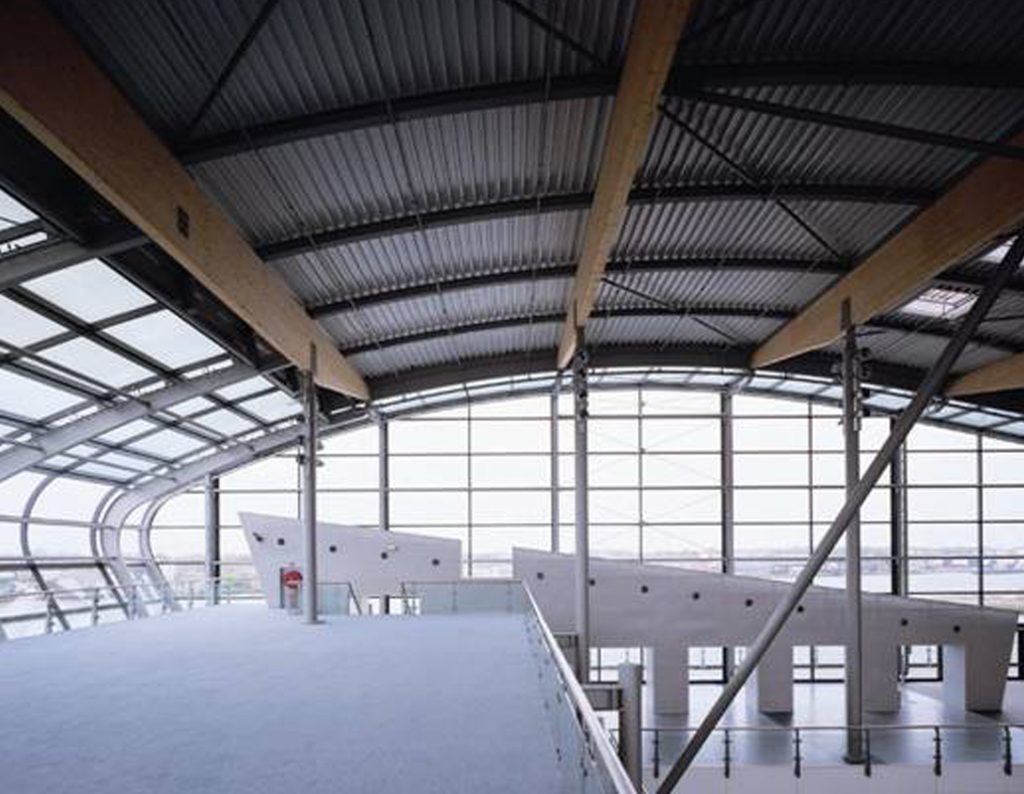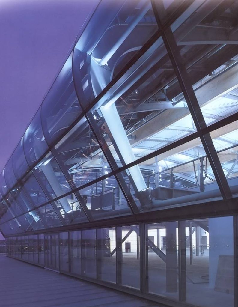 Er heeft een volledige integratie plaats gevonden tussen de architectuur en de constructie zoals te zien bij de stalen diagonale kokers ten behoeve van de stabiliteit die gekoppeld zijn aan de houten gelamineerde liggers. Illustratief zijn ook de uitwendige staalconstructies, loopbruggen, glazen liftschachten en “structural glazing”. Kenmerkend is het bijzonder gevormde dak met gebogen gelamineerde liggers op een staalconstructie, gebouwd op een betonnen parkeergarage