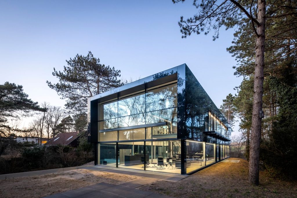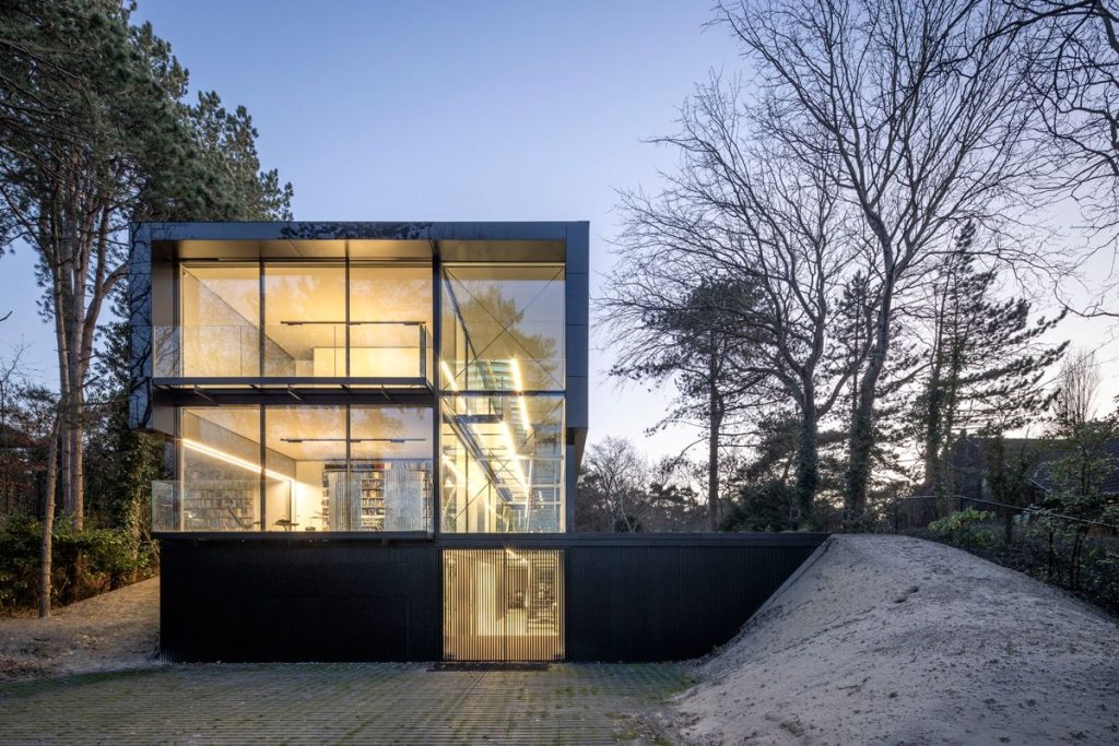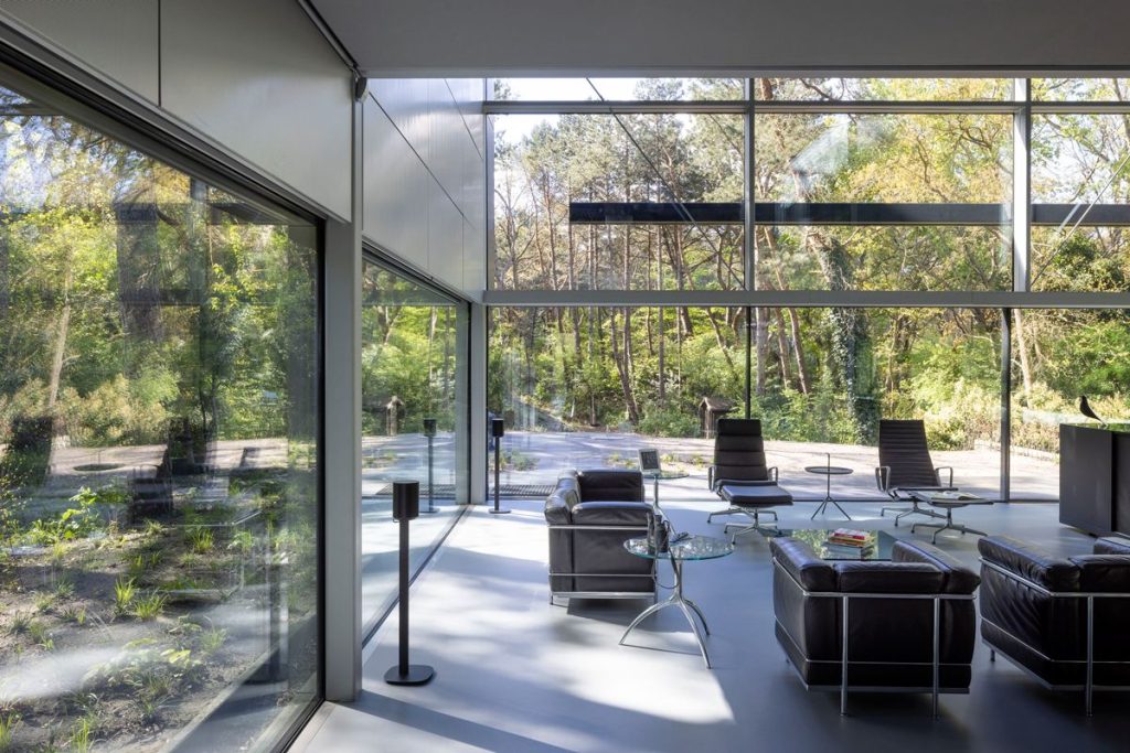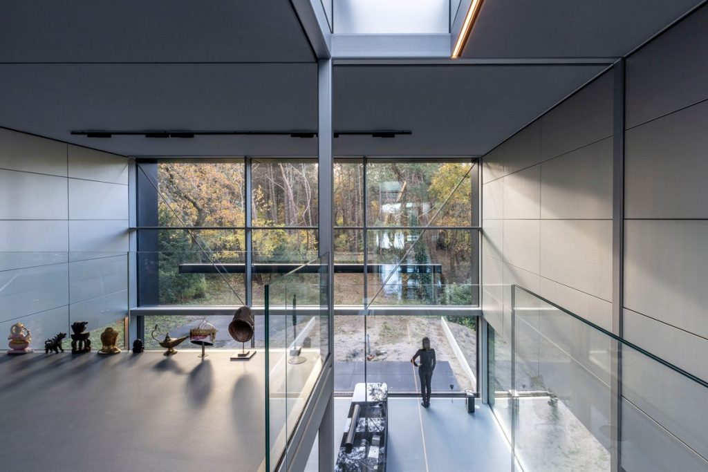 Villa Meijendel staat in het bosrijke duingebied van Wassenaar. Glazen gevels rondom en een lichtstraat over bijna de volledige lengte vullen de villa met daglicht.