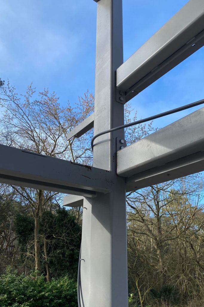 Bijzonder in het ontwerp zijn de subtiele staaldetails waarin verbindingsmiddelen zijn weggewerkt. Al het staalwerk is vanuit woonkamer en de hal zichtbaar waar glazen trappen en glazen loopbruggen op het staal zijn opgelegd.
