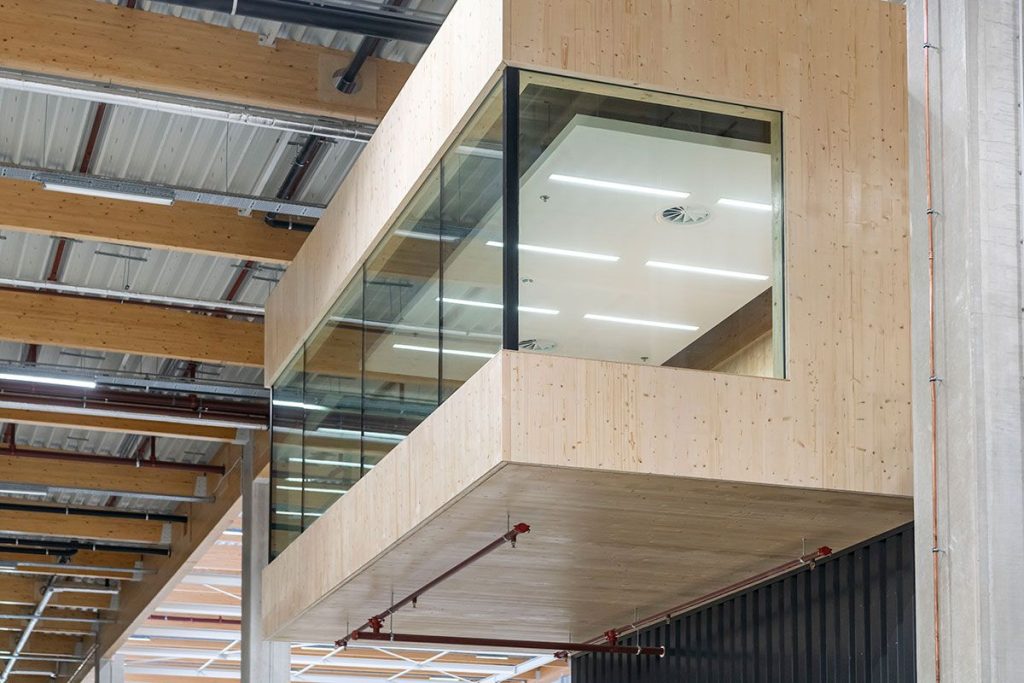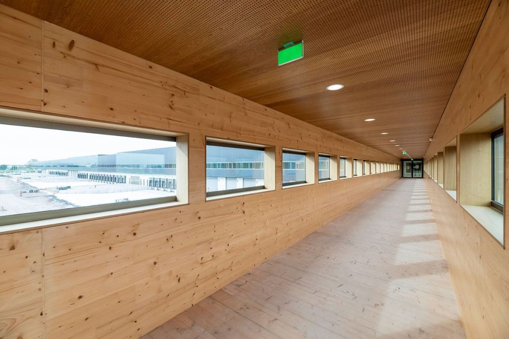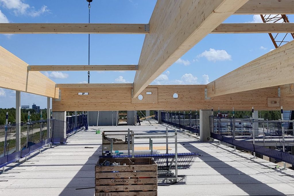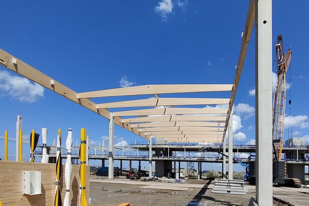 Het dak bestaat uit gelamineerde houten volle wand liggers met stalen dakplaten. De houten moerbalken zijn 1680 mm hoog, de secundaire liggers verlopen in hoogte van 720 mm tot 1240 mm in het midden van de overspanning. De stalen dakplaat zorgt zowel voor de schijfwerking als voor de kipstabiliteit van de houten liggers.