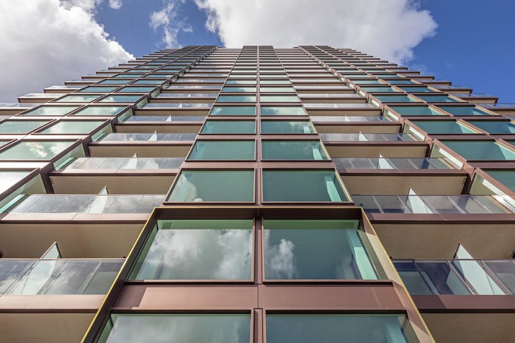 Kantoorgebouw getransformeerd tot toren met 200-250 appartementen, met hergebruik van betonconstructie, nieuwe stabiliteitswanden, prefab balkons en 3 extra verdiepingen in staal