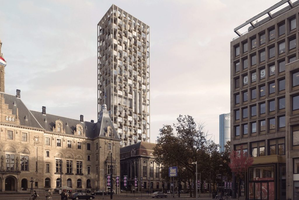 Herbestemming monumentaal gebouw met hotel en nieuwe 154 meter hoge appartemententoren op 25 meter hoge tafelconstructie met parkeerkelder