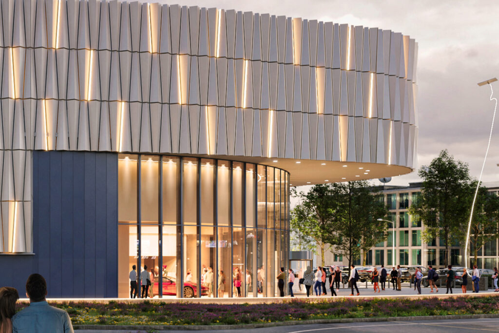 Het gebouw krijgt een markante vorm met een golvende lamellengevel en wordt opgetild boven het maaiveld