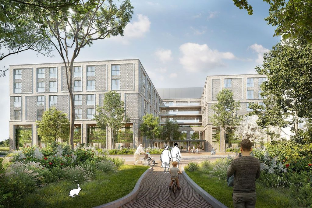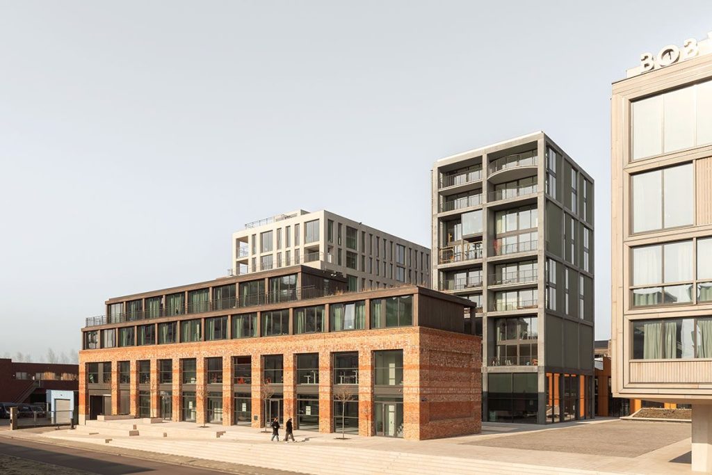 Duurzaam nieuw woon-werkgebied met zes gebouwen, modulaire houten gevels, gezamenlijke parkeerkelder, groene daken en circulaire voorzieningen