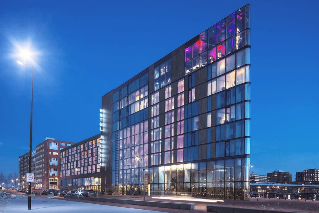 Hotel met atrium tot 30 m hoogte, modulair en energieneutraal, hoofddraagstructuur van beton en hout, BREEAM-Excellent